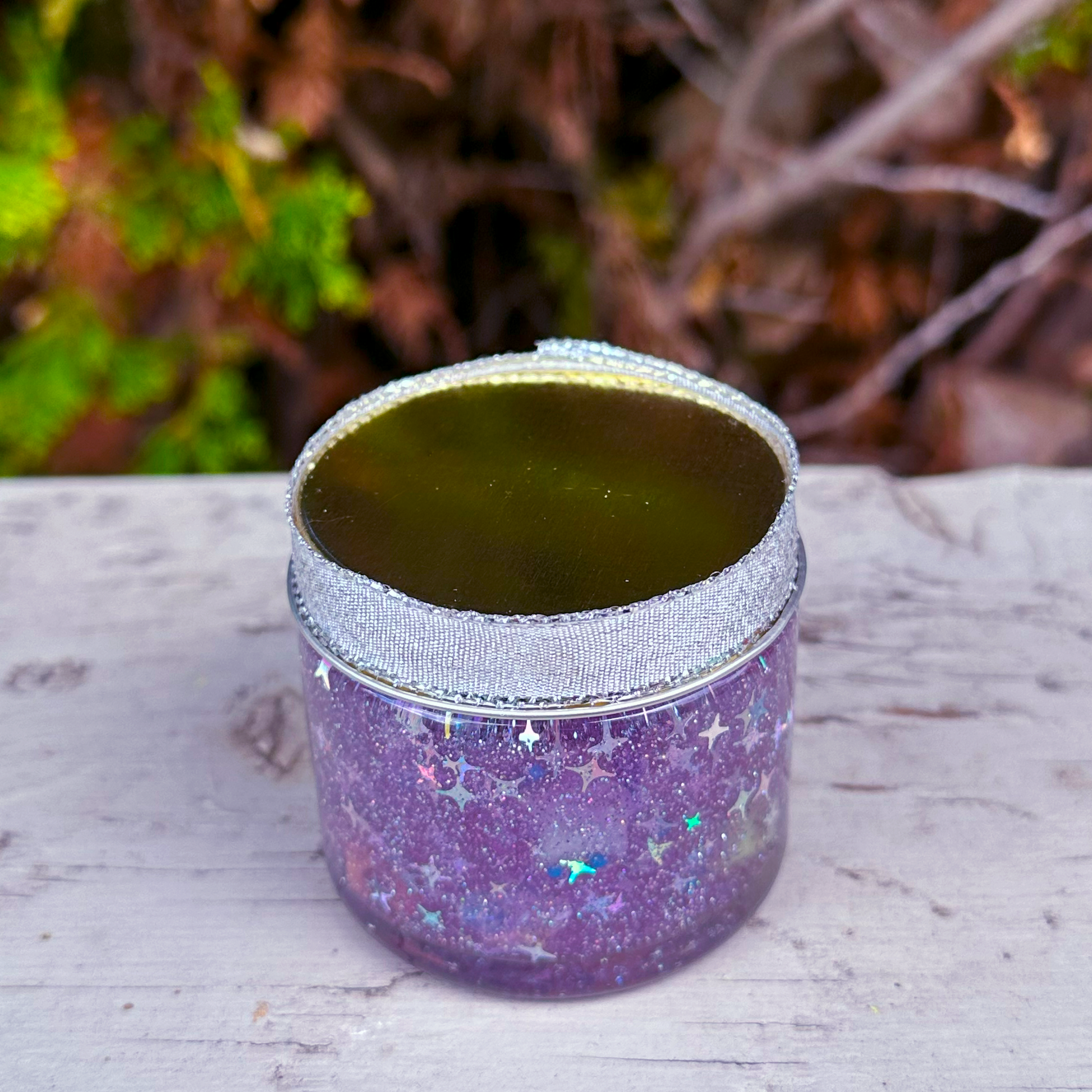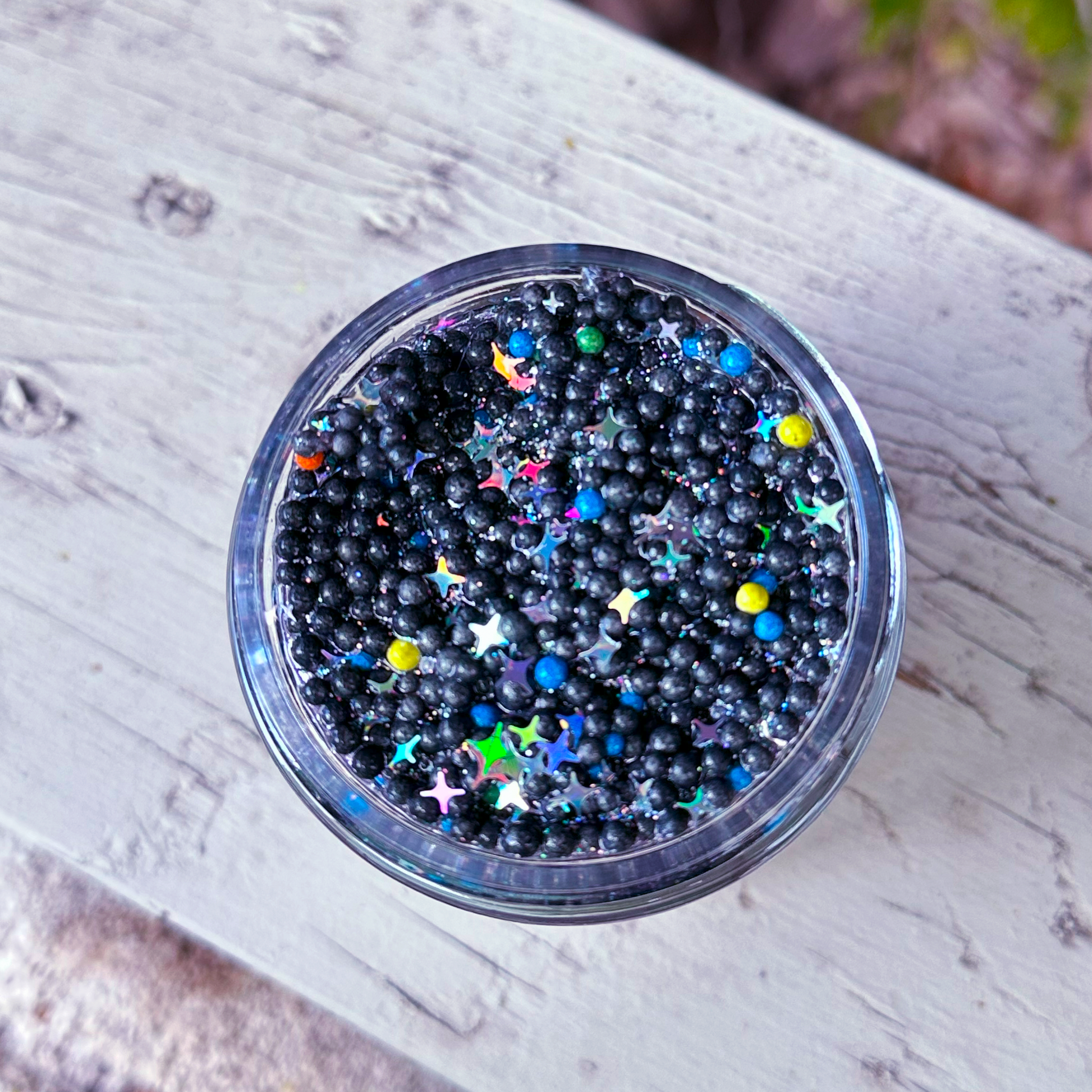 This coated clear slime is packed with black floam to represent the scattering of darkness, star beads for the brightness and strength of the stars, holographic and star glitters for the stars shining through space, and a purple to teal iridescent color shift that reminds me of far away galaxies.