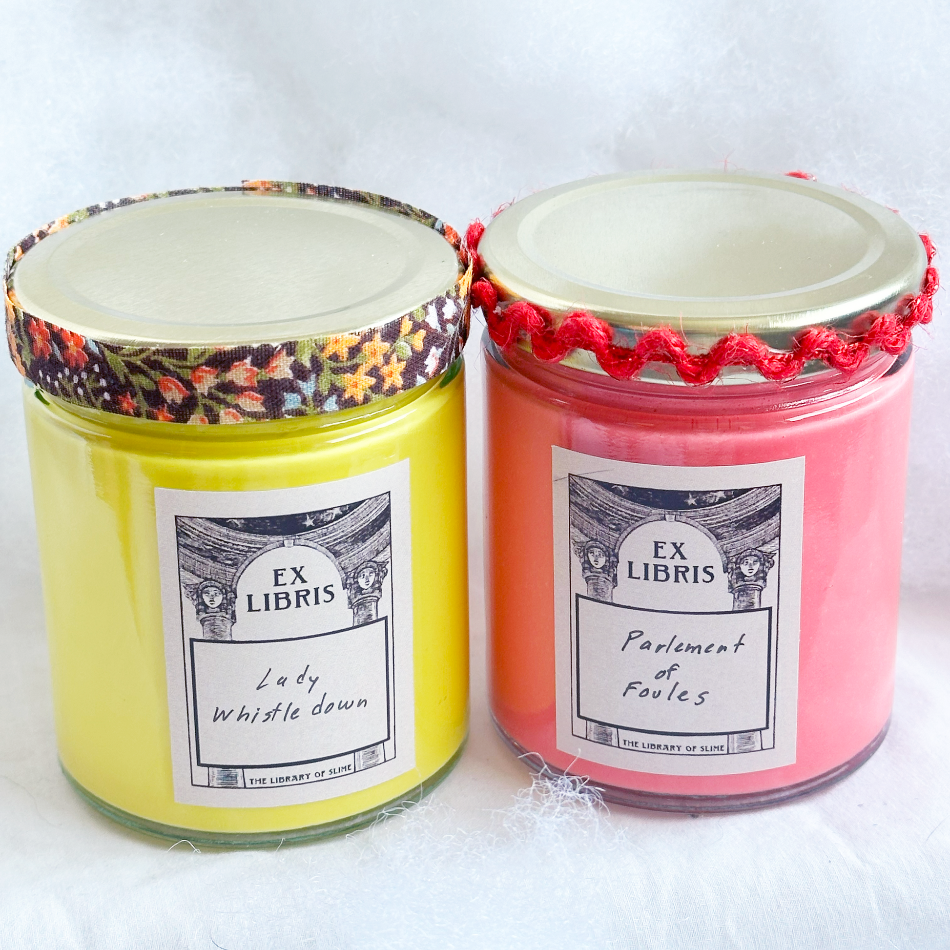 6oz duo version comes both six ounce slimes, black quill, pink beads, pink glitter, and Romancing Mister Slimerton book charm; two hand painted pom pom birds, heart glitter, and A Brief History of Valentine's Day book charm