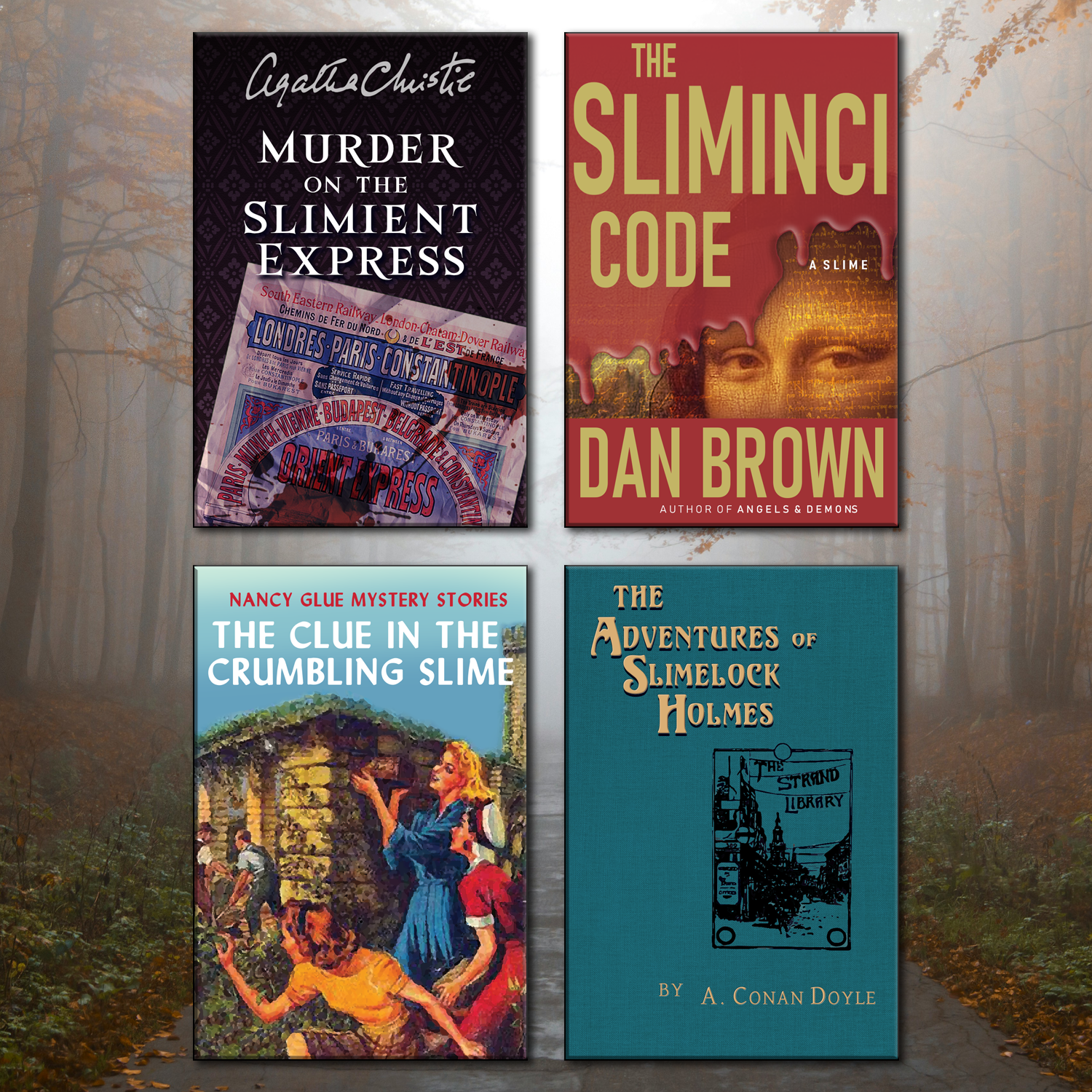 The Mysterious Affair of Slimes book charm collection includes The SliMinci Code, The Clue in the Crumbling Slime, The Adventures of Slimelock Holmes, and Murder on the Slimient Express.