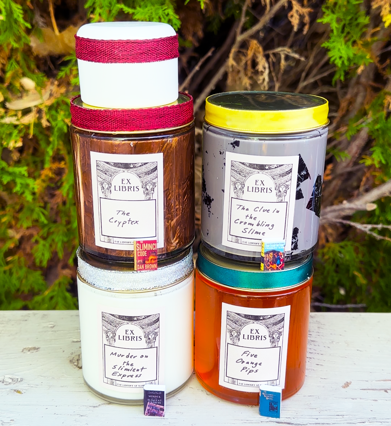 The Cryptex, The Five Orange Pips, The Clue in the Crumbling Slime, and Murder on the Slimient Express.