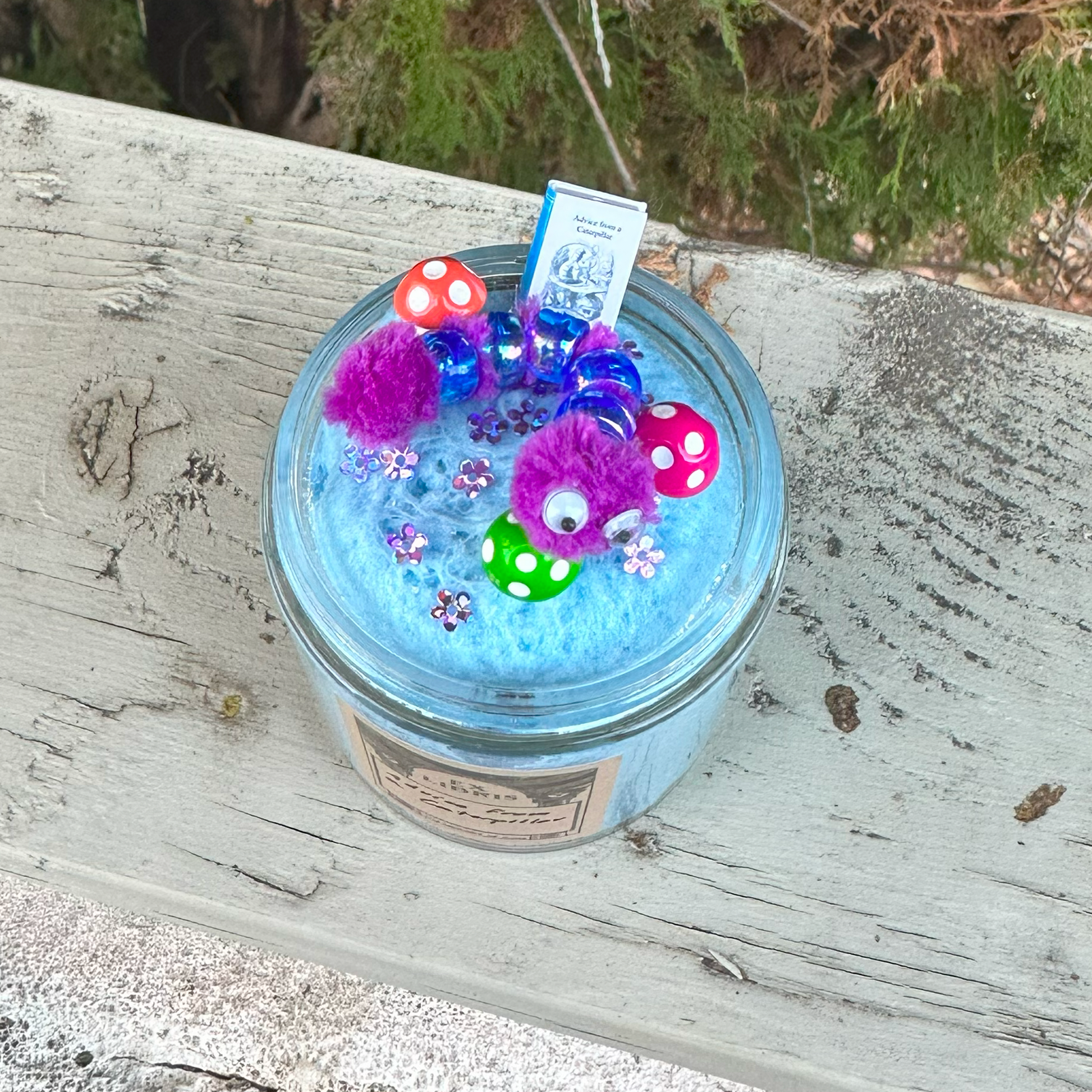 This slime is not wrong from beginning to end! The texture is fluffy, laying somewhere between an icee and a cloud, but without the coldness. Feels soft and gentle in the hands, and does provide some pops! Does leave minimal snow residue on the hands that is easily wiped or washed away. Comes with three mushrooms (random colors) and handmade caterpillar charm.