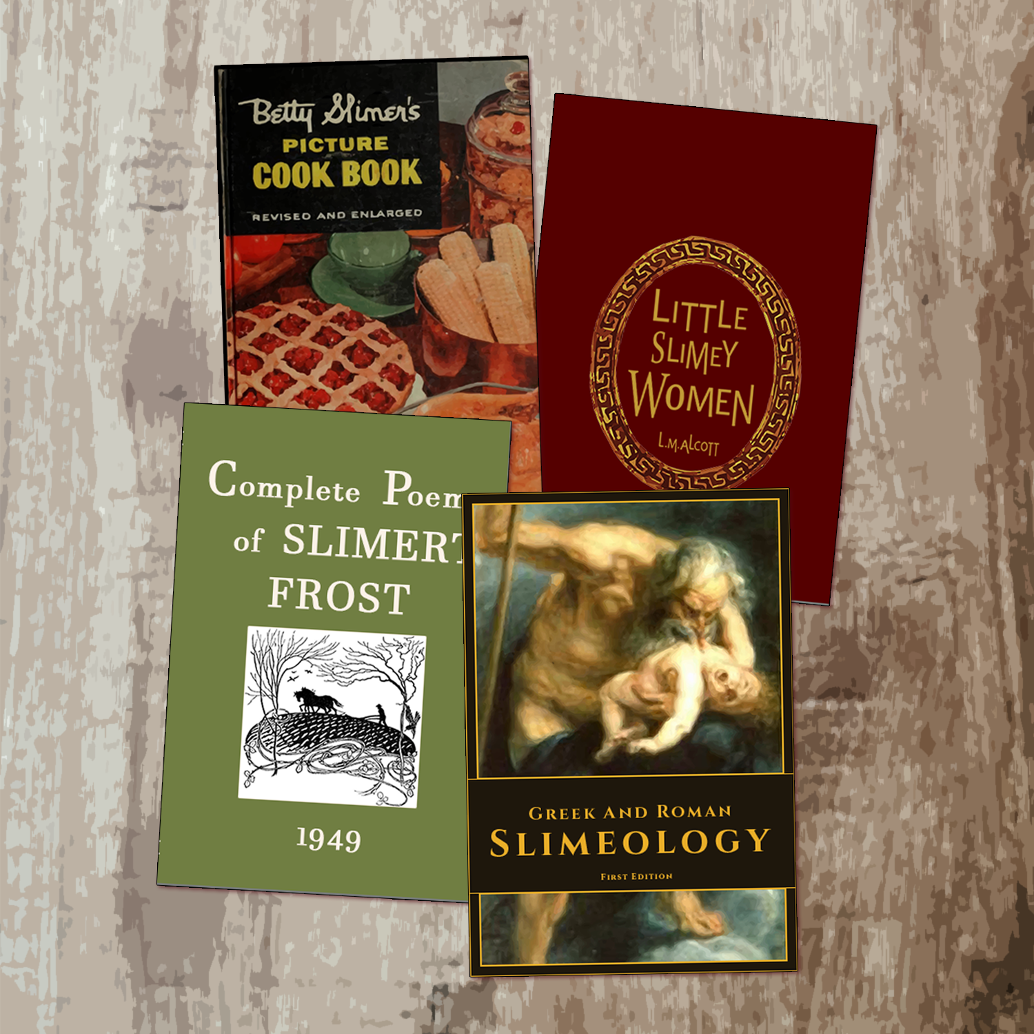 Cold Autumn book collection includes Greek and Roman Slimology, Little Slimey Women, The Complete Poems of Slimert Frost, and Betty Slimer's Picture Cookbook.