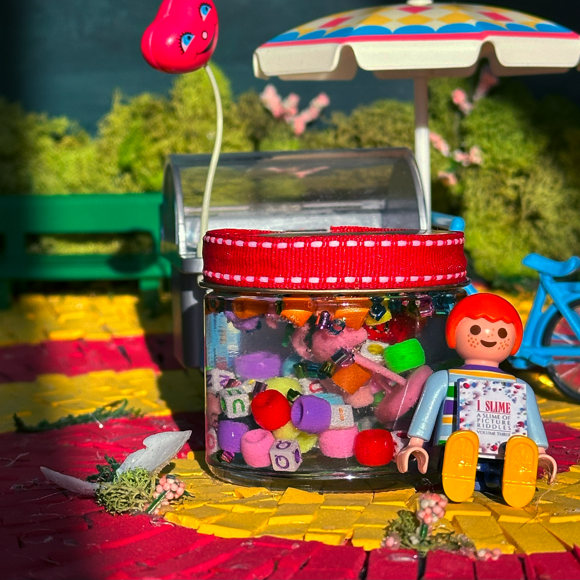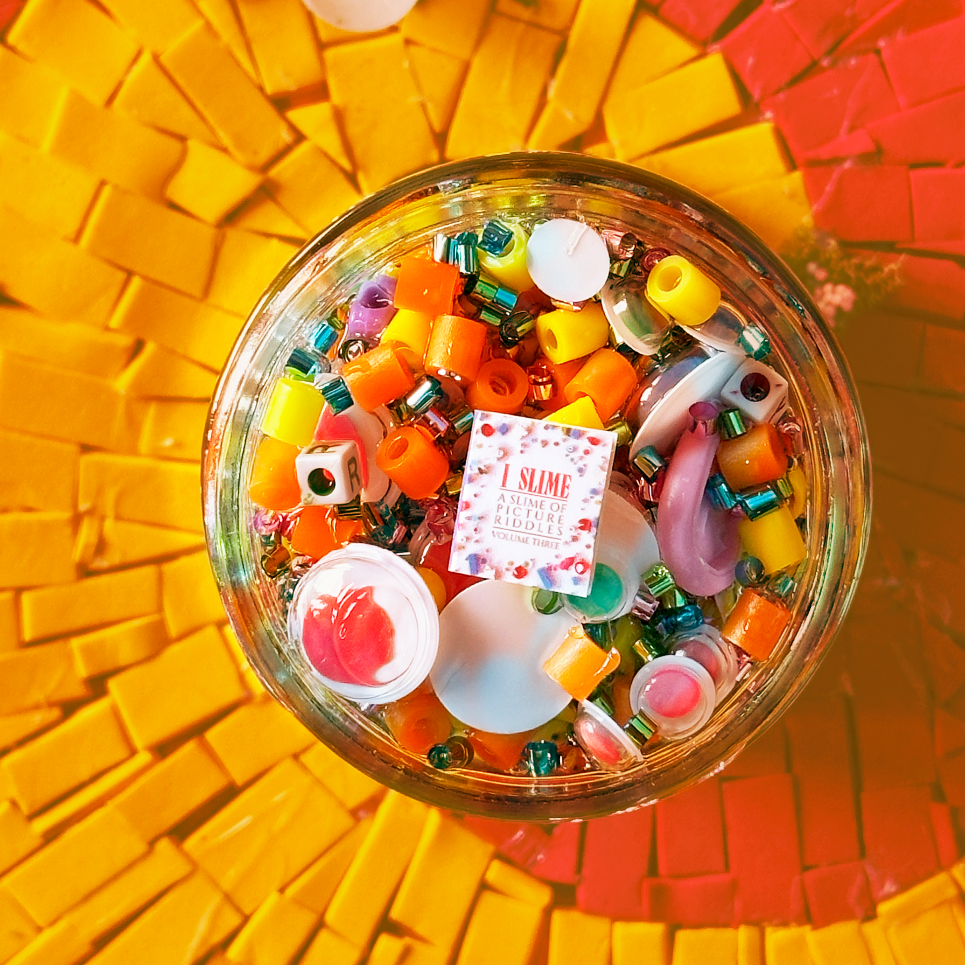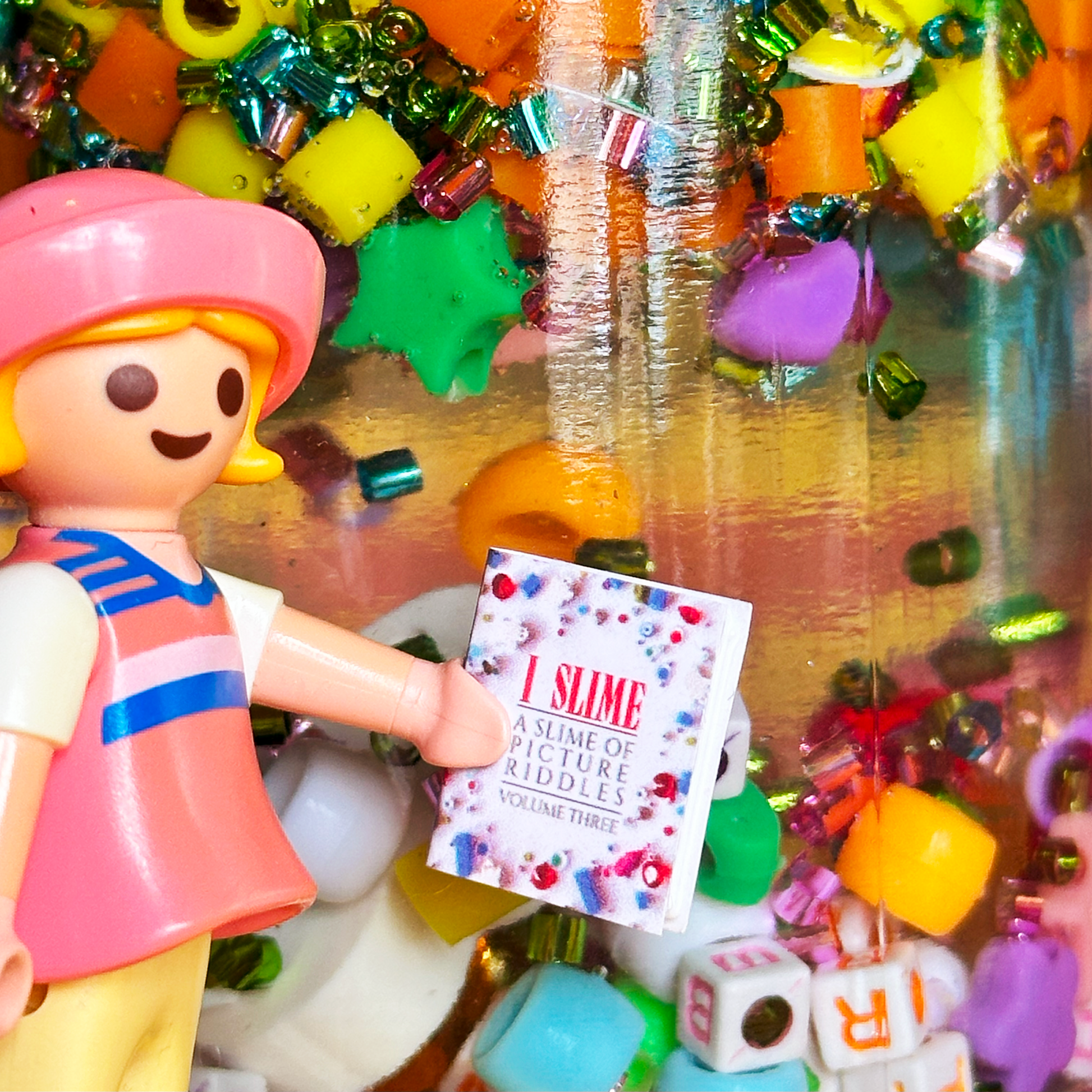 I spread out the charms and beads from the slime on a white background to imitate Walter Wick’s photography style from the books.