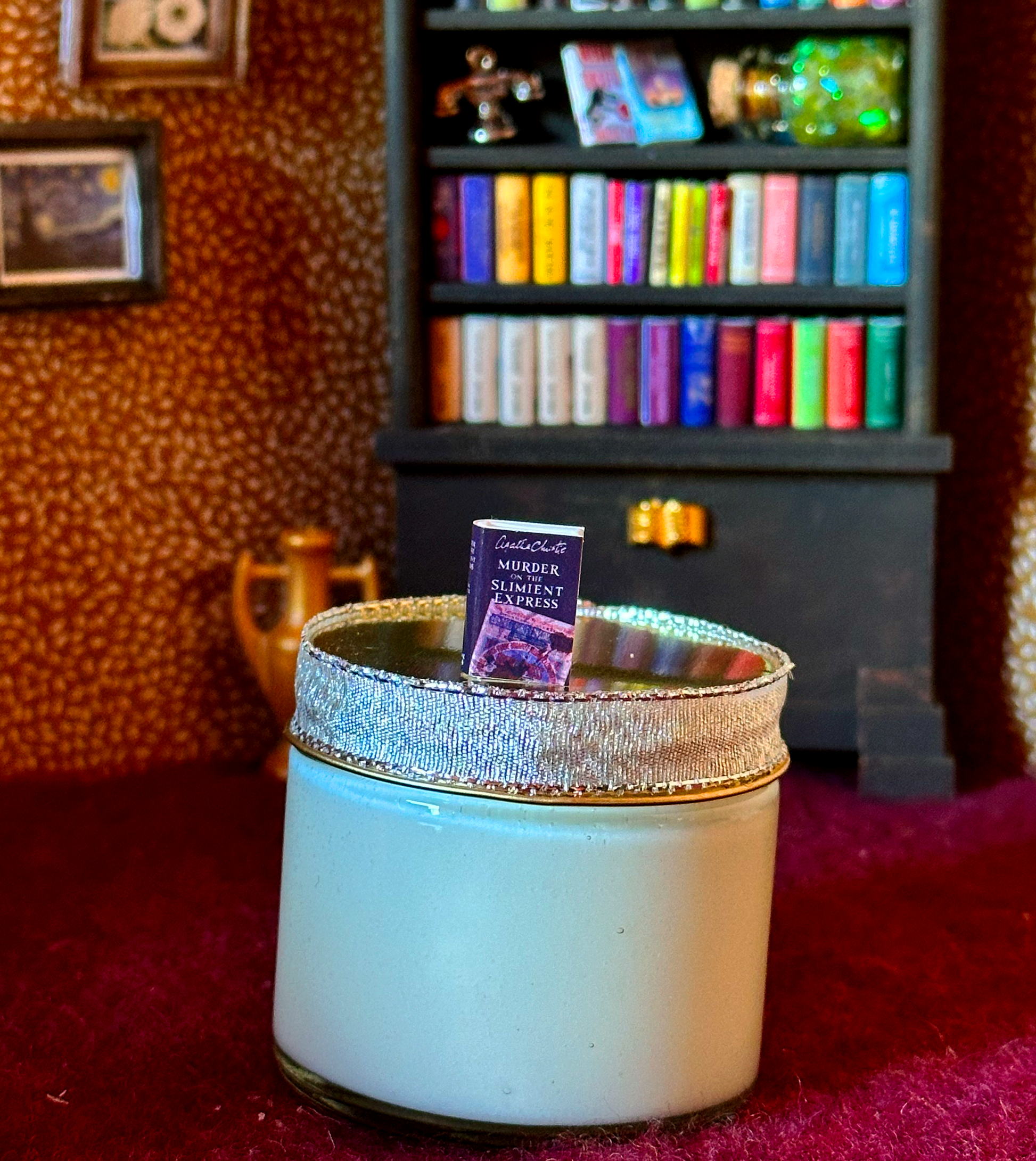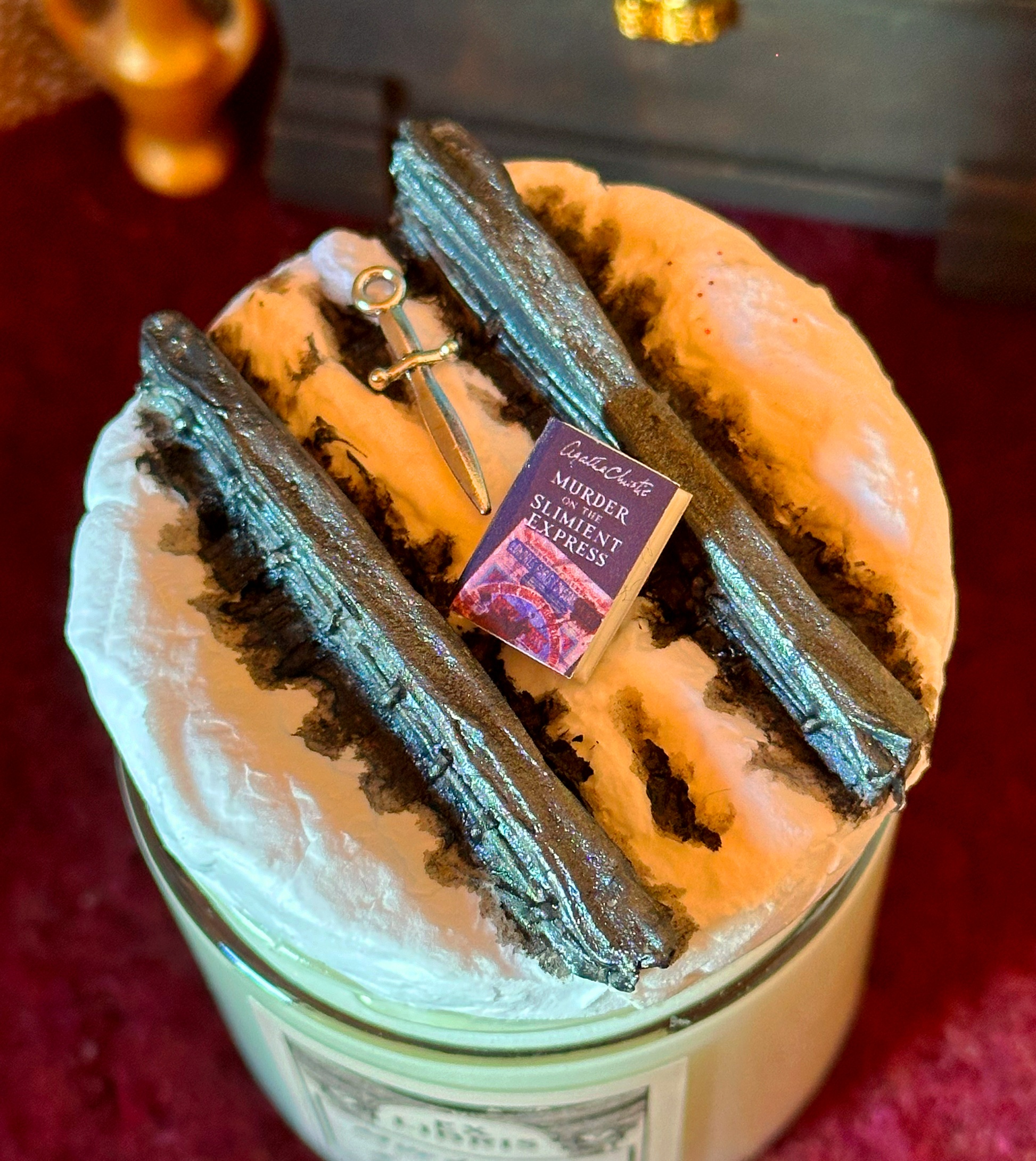 6oz version comes with train track clay topper, and dagger and "Murder on the Slimient Express" book charm