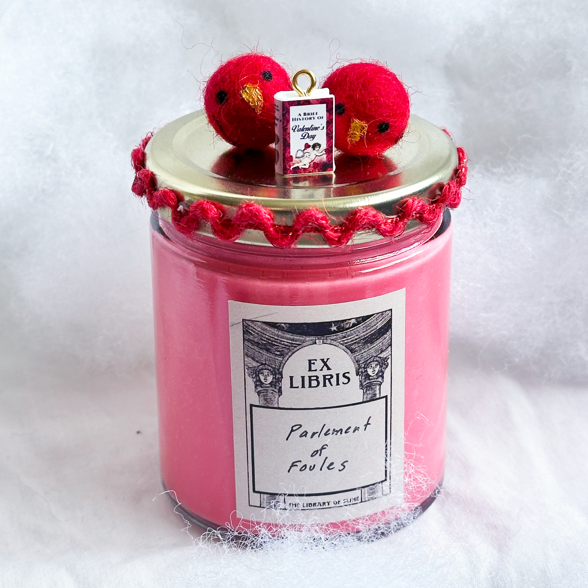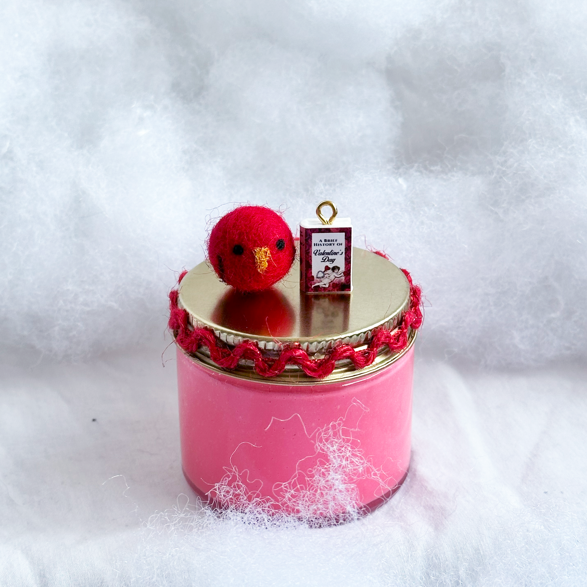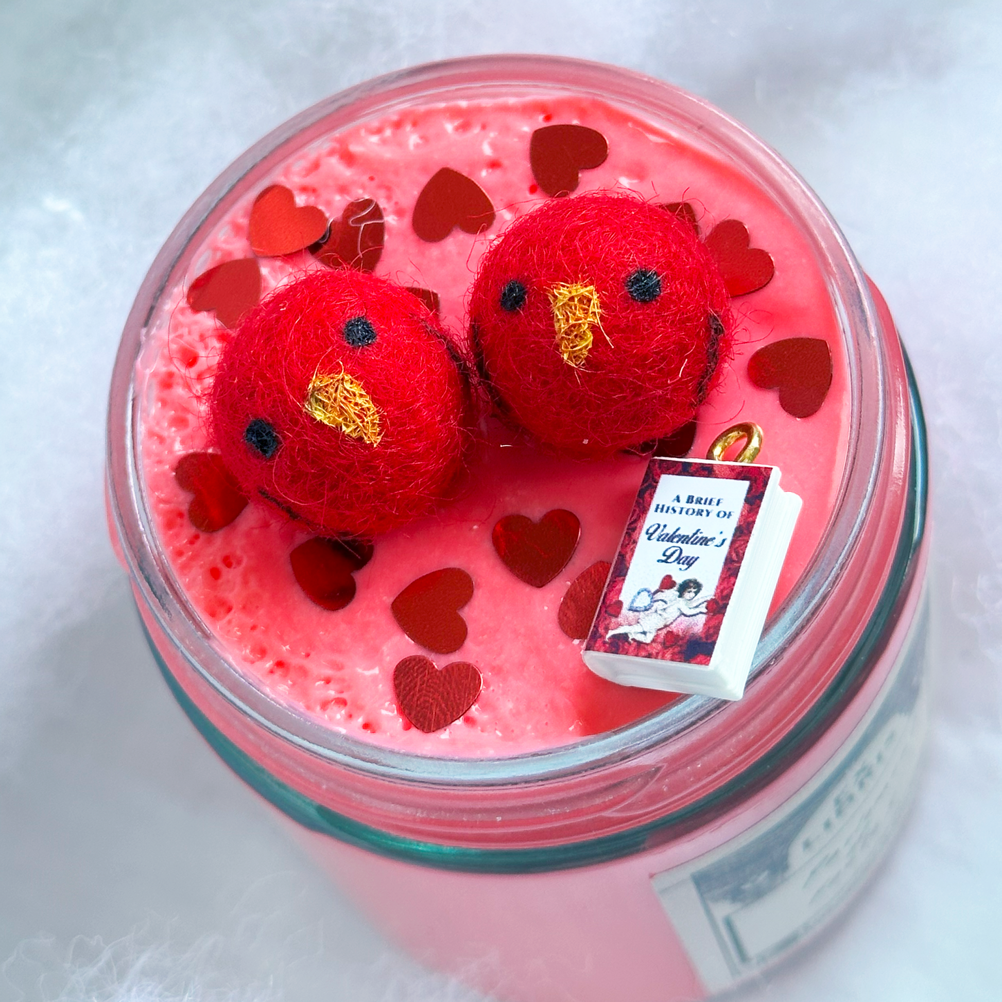 6oz version comes with two hand painted pom pom birds, heart glitter, and A Brief History of Valentine's Day book charm