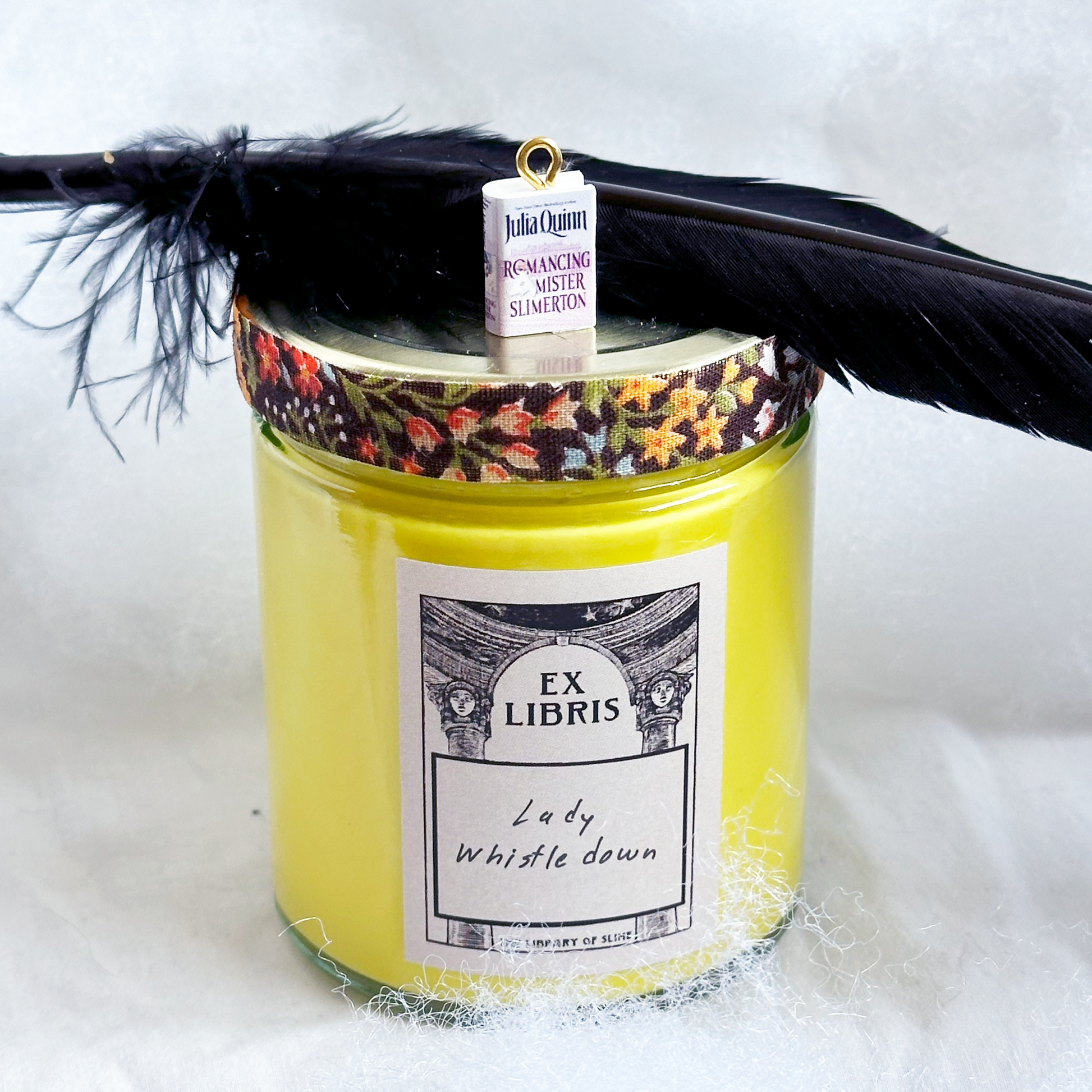 The pink beads and glitter represent Penelope's coming into her own in the book, and quill pen for her identity as Lady Whistledown. The quill is made from a real feather, cleaned and hand-cut by the Head Librarian.