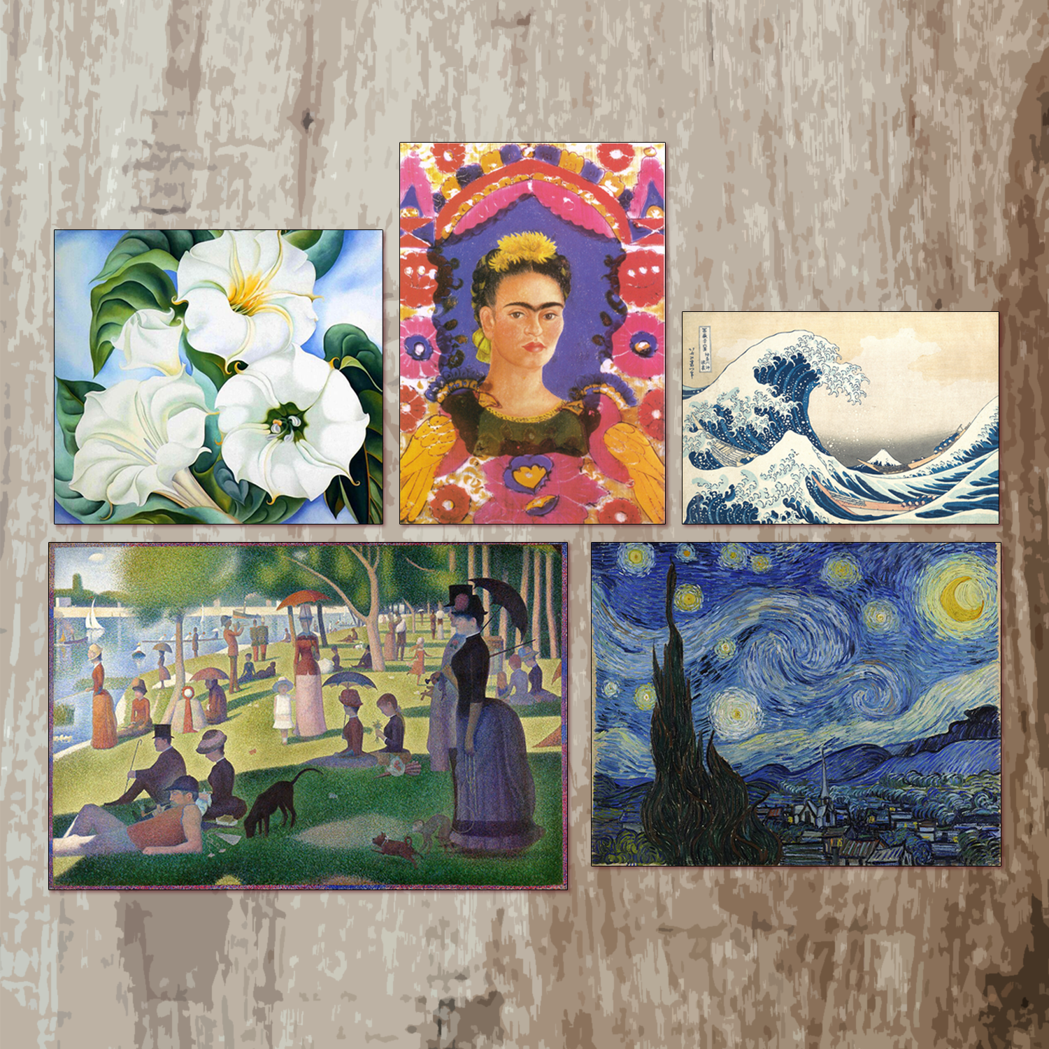 Art Museum painting charm collection includes The Great Wave Off Kanagawa, Jimson Weed, A Sunday Afternoon on the Island of La Grande Jatte, The Frame, and The Starry Night.