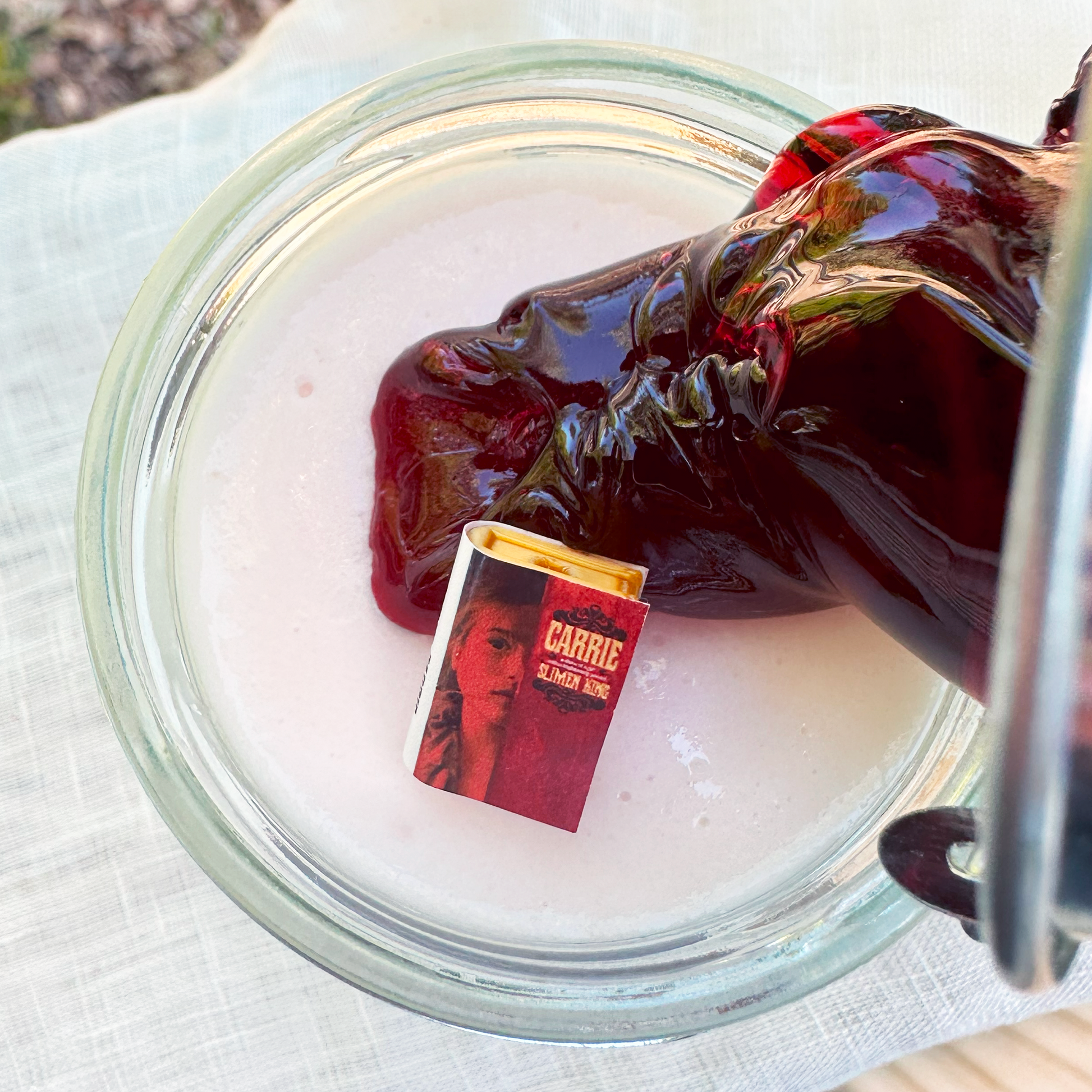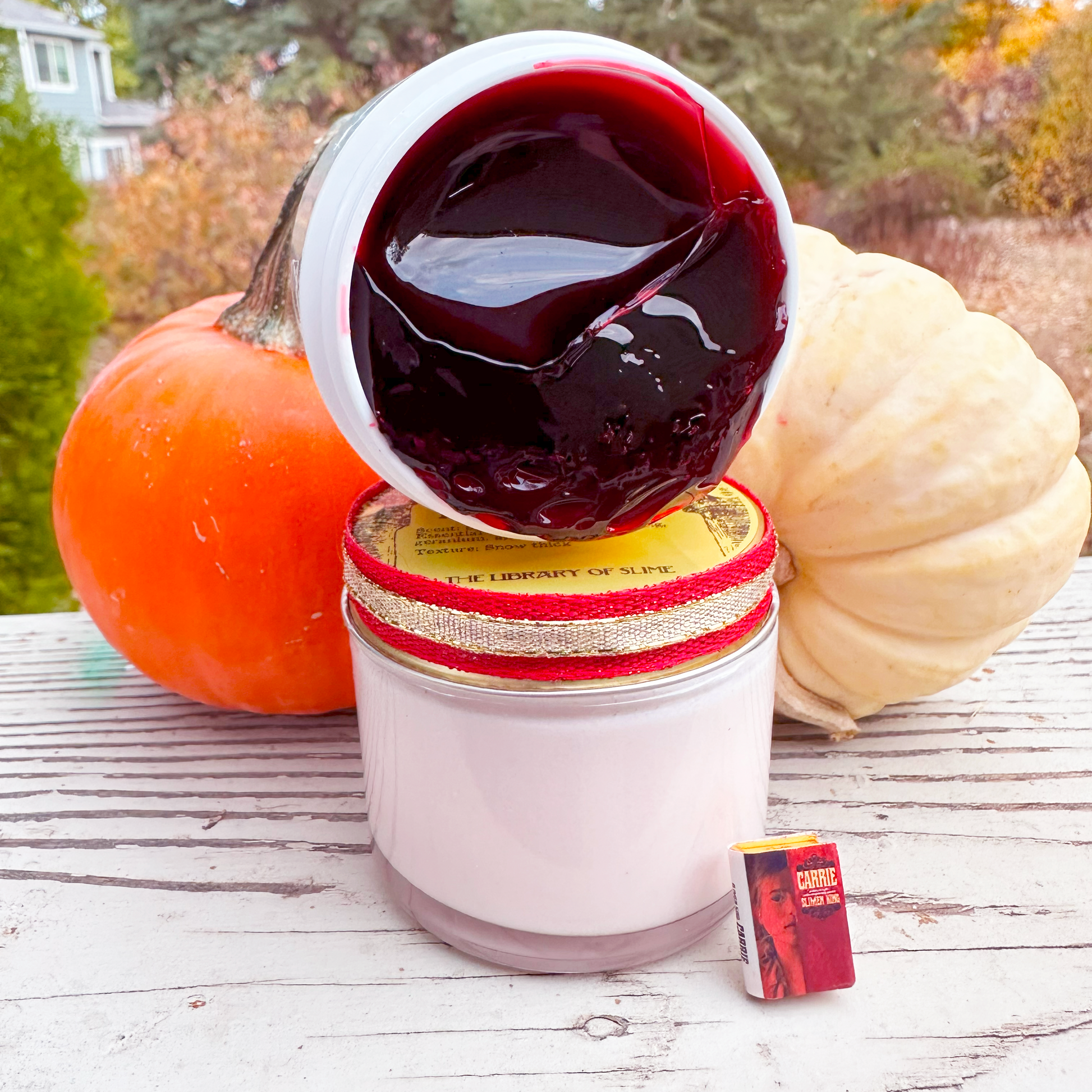 Carrie is bullied relentlessly by her peers, and this culminates in her being winning prom queen only so she can be set up to have pig blood dumped on her in a final act of humiliation. The story has a theme of sin and blood, and it is this final dreadful act that pushes Carrie over the edge. The bucket included with this slime has "CARRIE WHITE EATS SHIT" on it, a quote that appears throughout the book. The title for this slime comes from the chapter name when the prank and subsequent horror occurs.