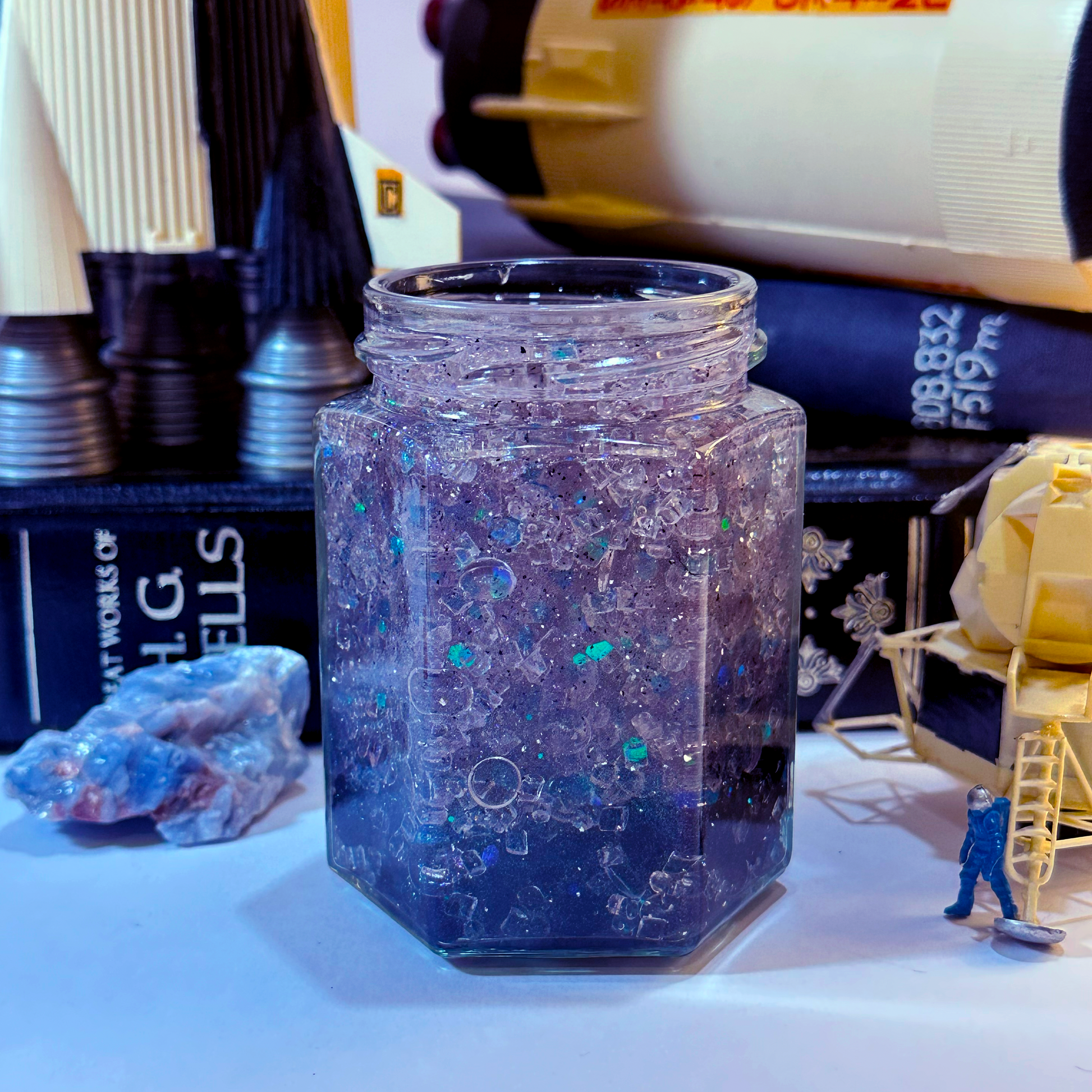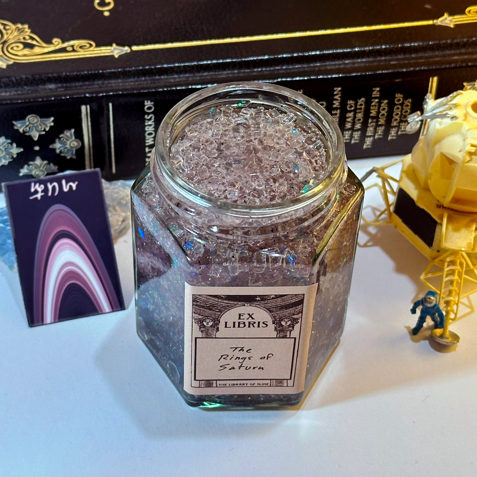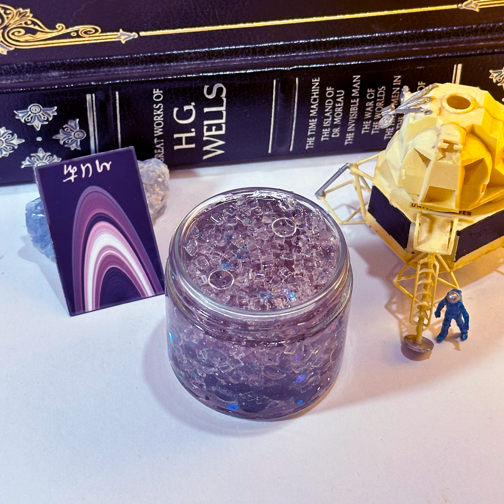 The rings of Saturn are known to be primarily composed of water, ice, and some rocky material. To represent that, this slime is packed with fishbowl and sugar scrub beads, as well as some gravel. This combo in the coated base created a delightful and non-abrasive crunch.