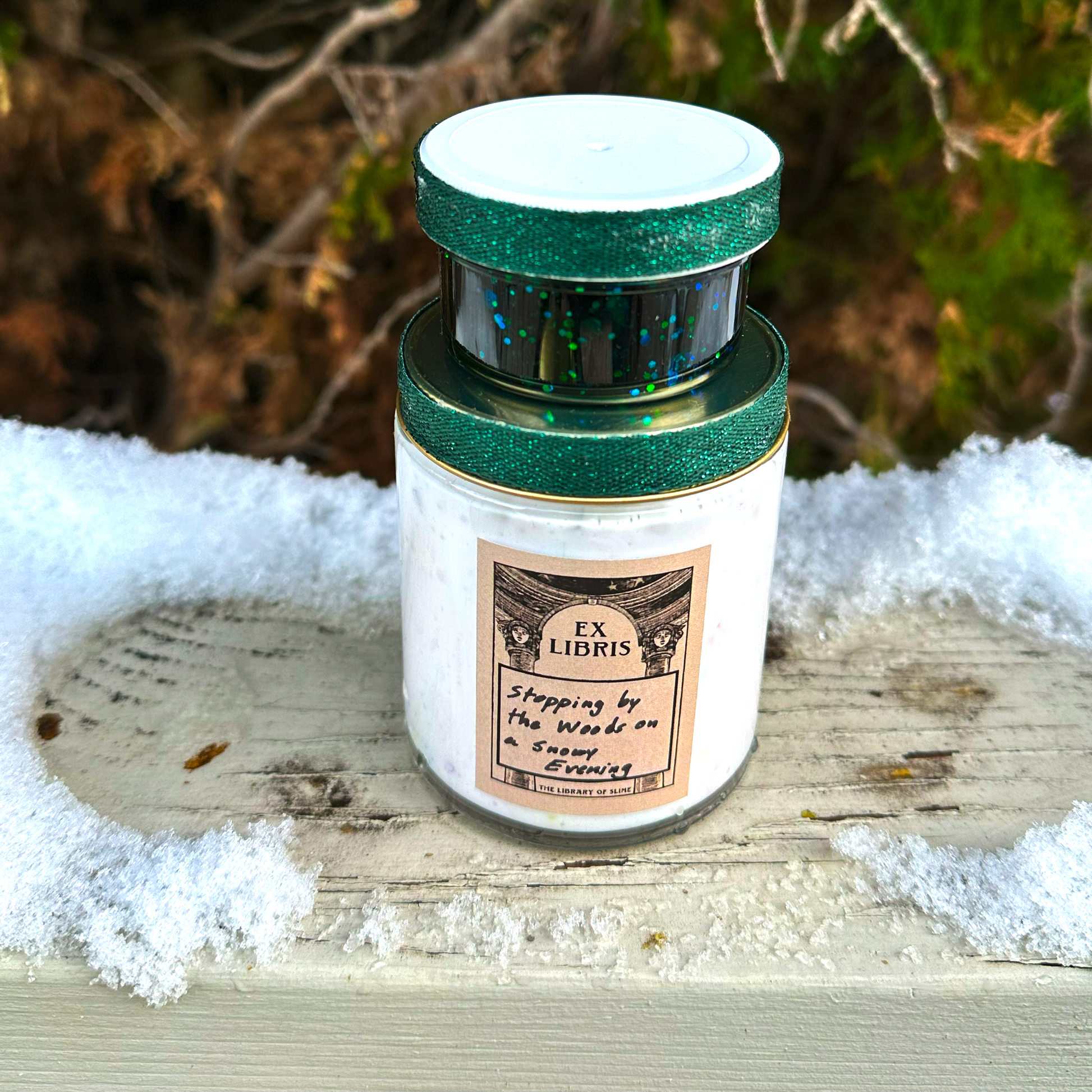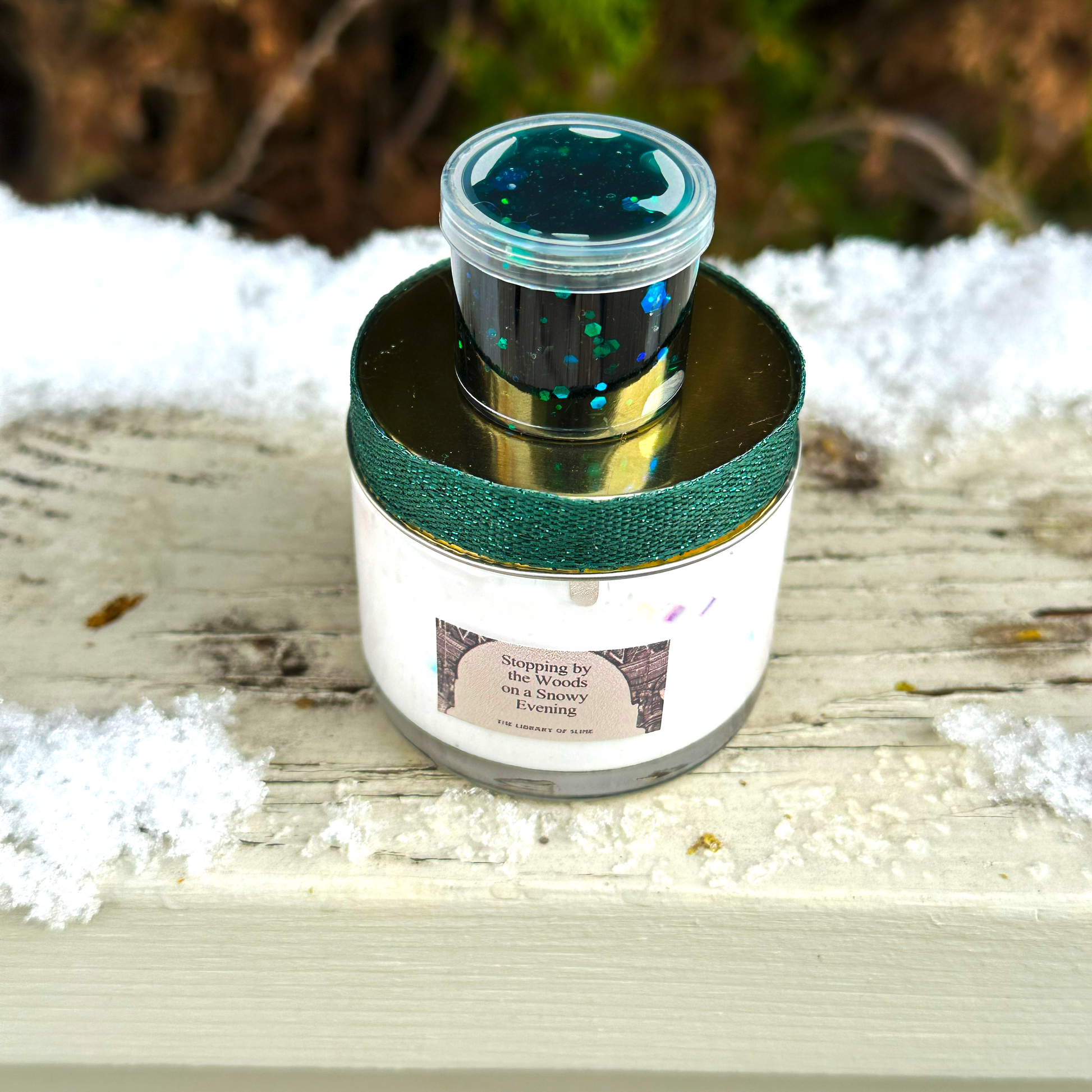 Travel softly through a winter wood covered in snow with this slime inspired by Robert Frost's famous poem. The base is a new recipe thick and glossy, with small and large foam balls, bingsu glitters, and plastic snow to give a super satisfying multi-factor crunch. Adding the glittering deep green topper gives this slime the appearance of a forest covered in thick snow.