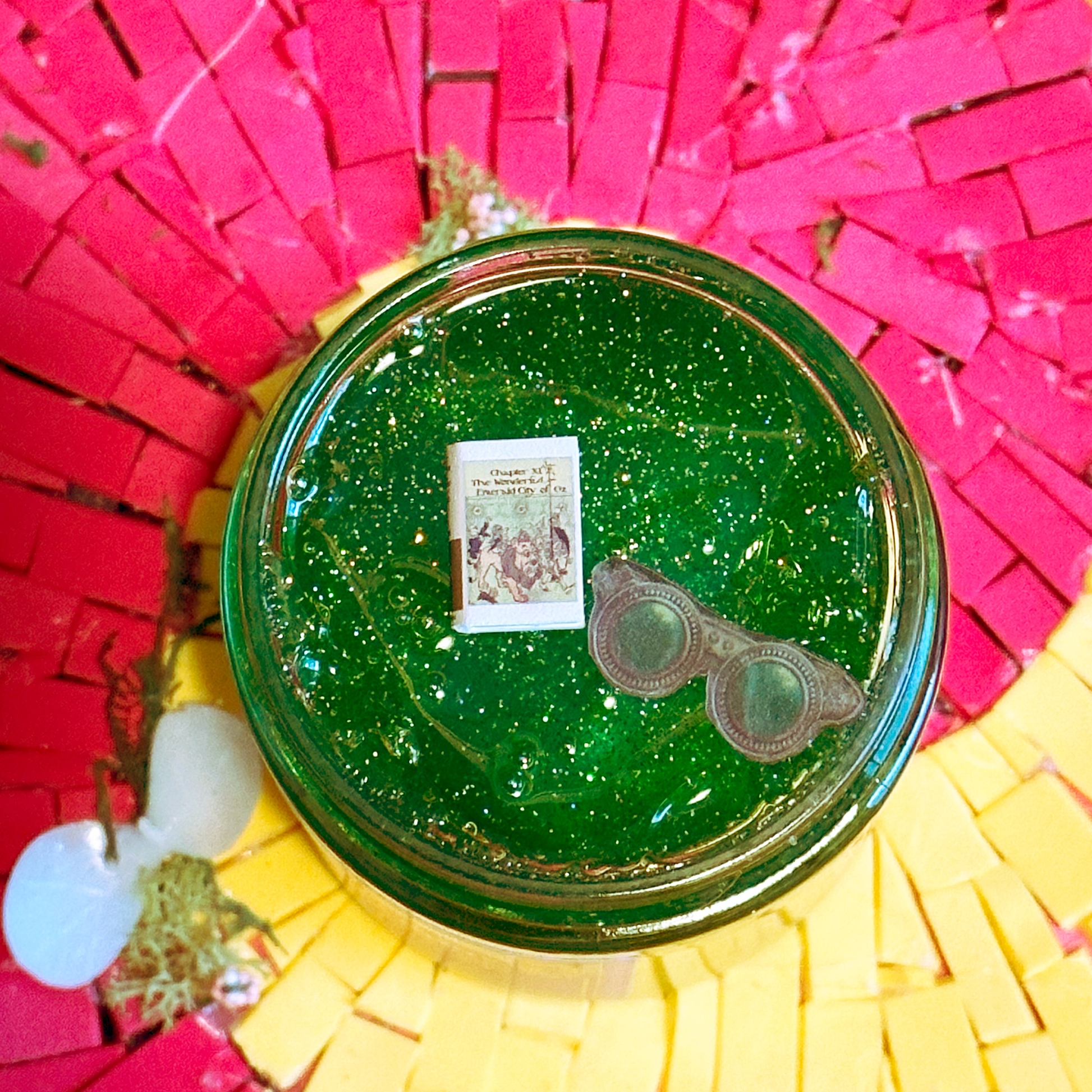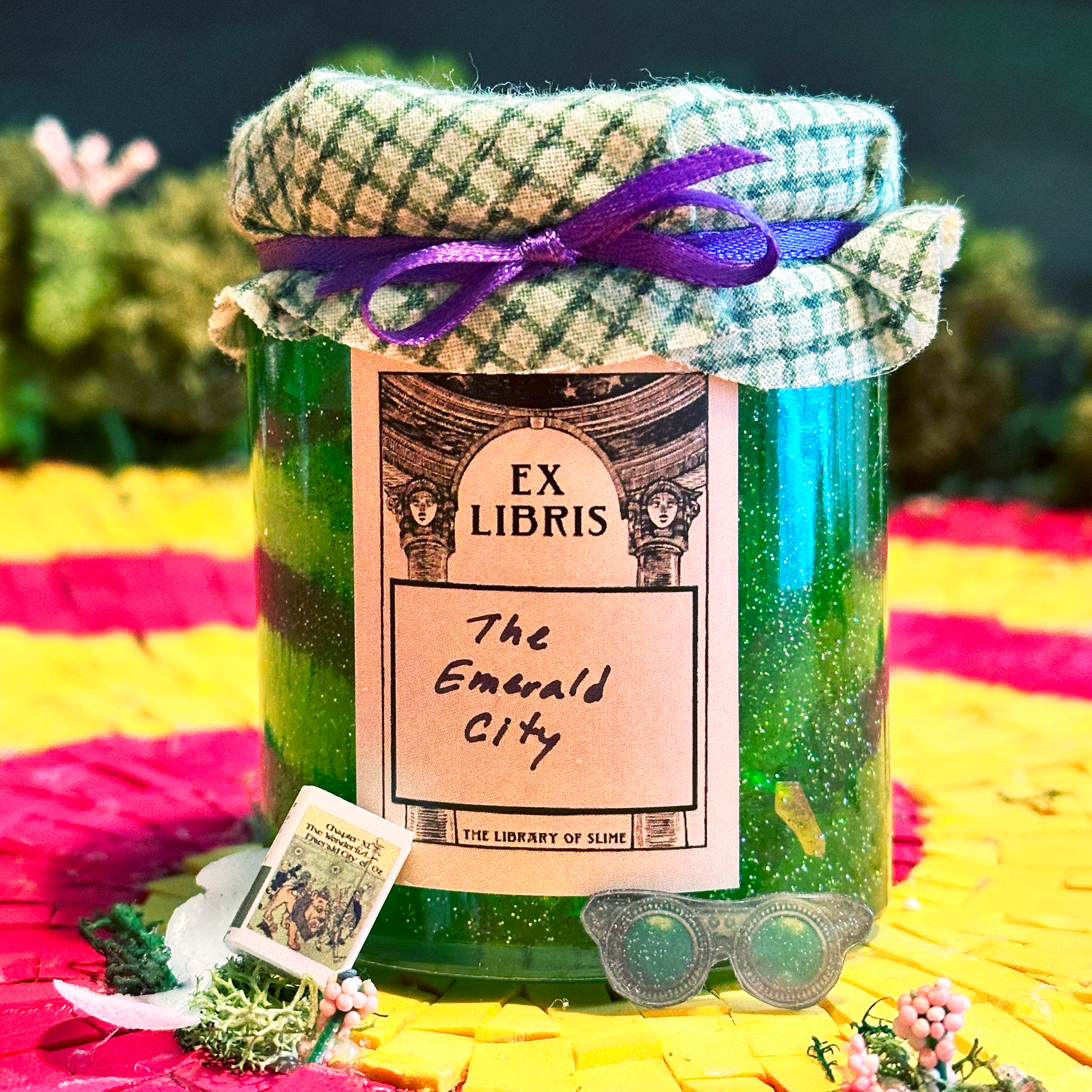The gems in this slime are quite pokey, and are not recommended for those with sensitive hands. To pair with the illusion of the white city masked in green, this slime is green with clear iridescent gems.