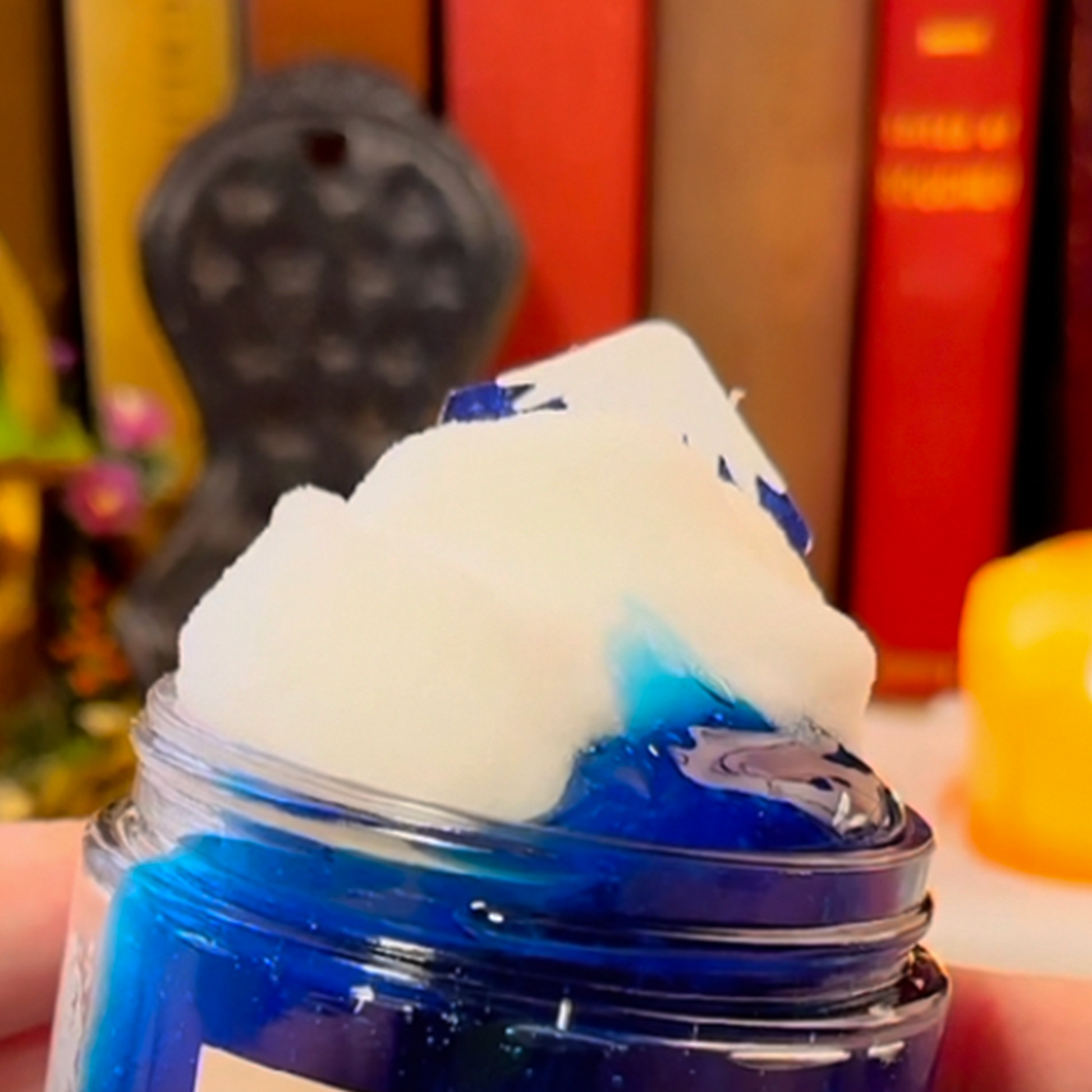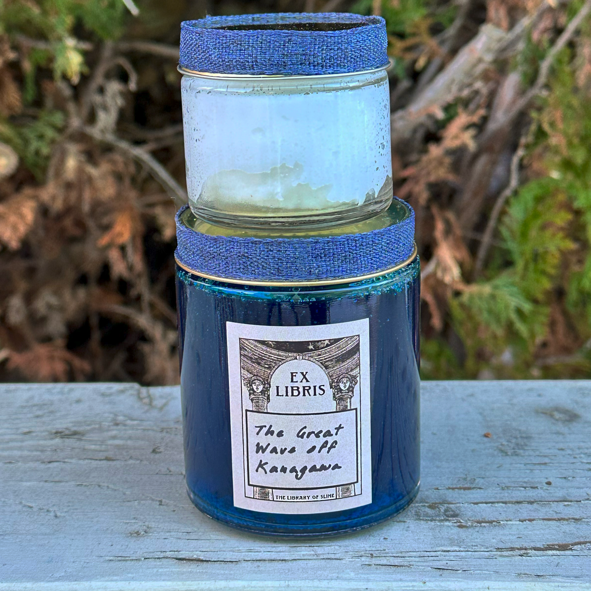 To capture the essence of the deep blue and striking white of the print, this slime features a coated clear blue slime that gets topped with a bright white icee. Combining the two will simulate the rolling waves off Kanagawa. Fully mixing these results in a foamy, sizzly coated jelly texture.
