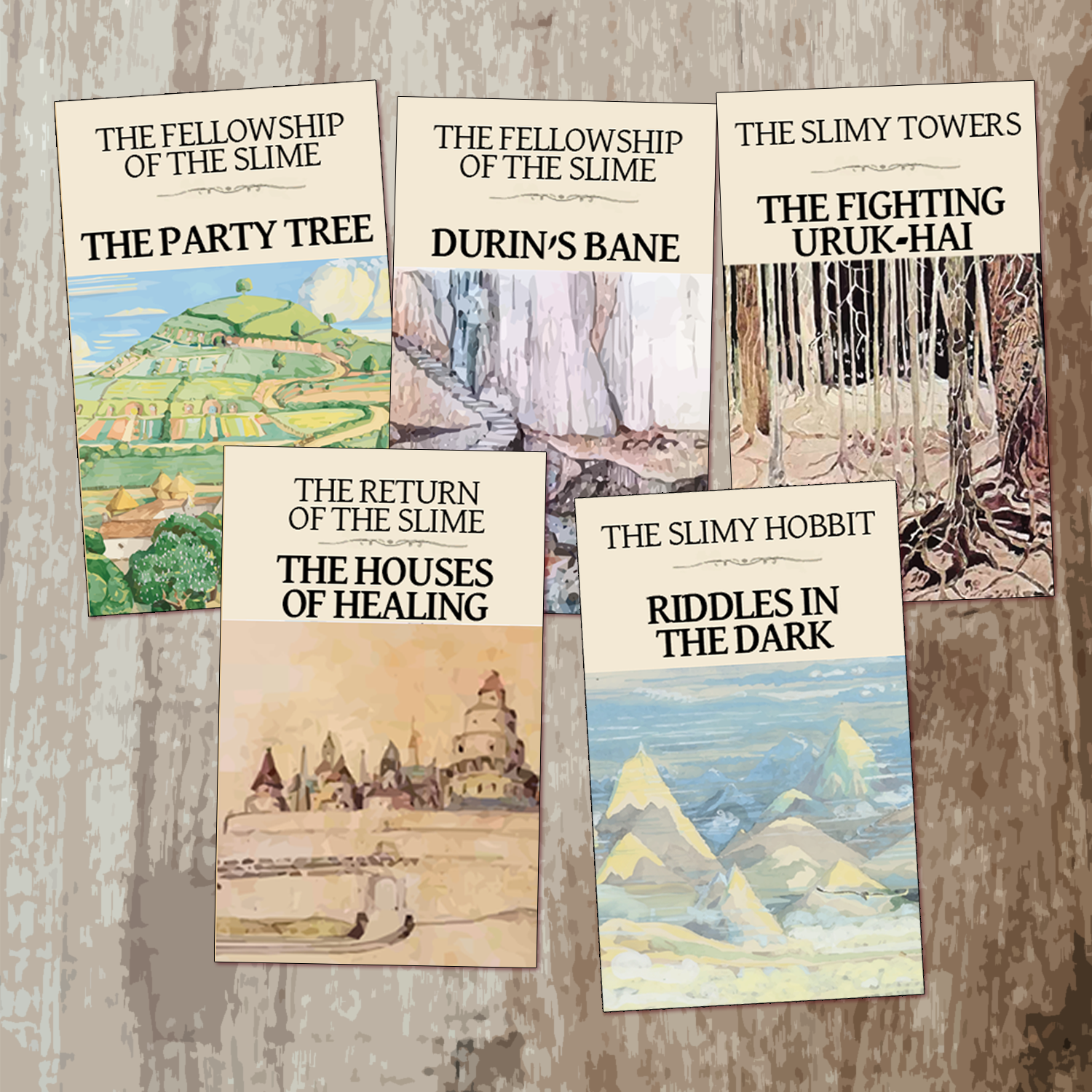 The Lord of the Slimes book charm collection includes Riddles in the Dark, The Party Tree, Durin's Bane, The Fighting Uruk-hai, and The Houses of Healing.