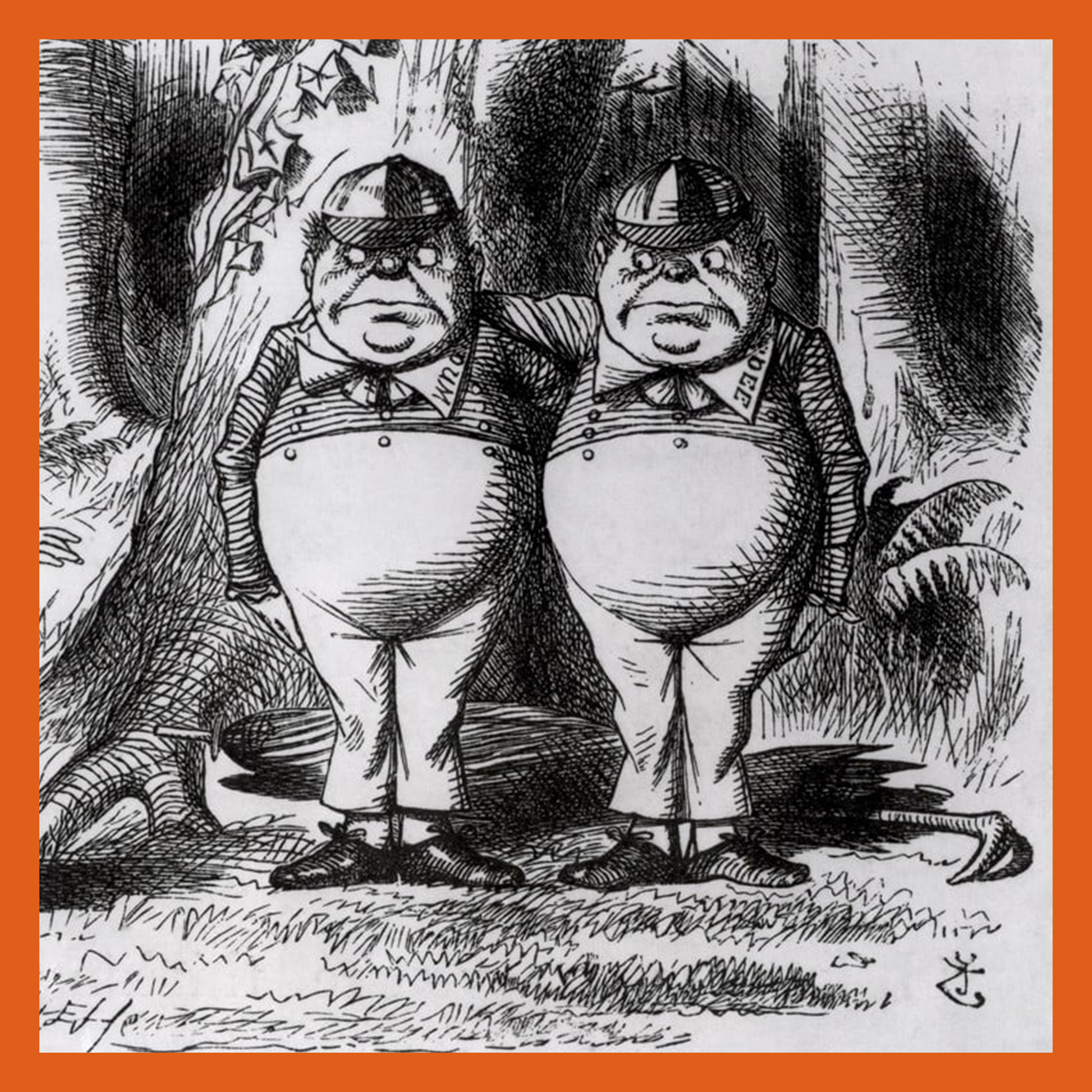 They were standing under a tree, each with an arm round the other’s neck, and Alice knew which was which in a moment, because one of them had “DUM” embroidered on his collar, and the other “DEE.” “I suppose they’ve each got ‘TWEEDLE’ round at the back of the collar,” she said to herself.